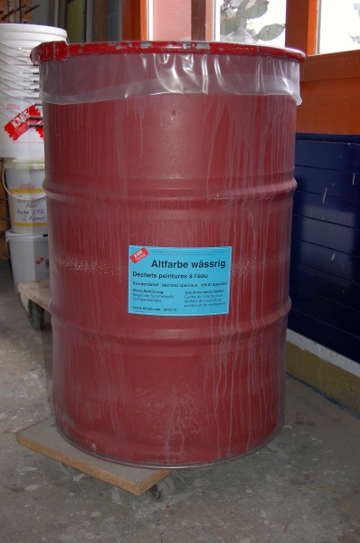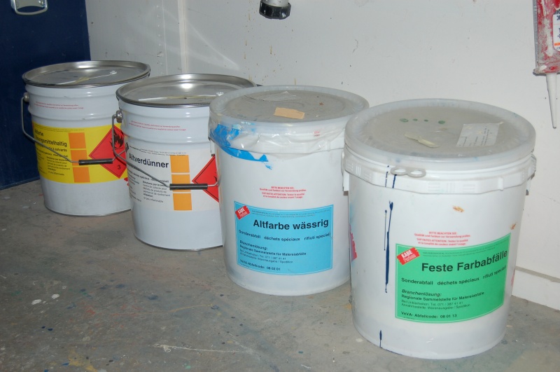 Die umweltgerechte Entsorgung erfolgt über Eimergebinde direkt bei unserem Farbenlieferanten. Dort werden Farbreste fachmännisch entsorgt und, wo möglich, wiederverwertet.